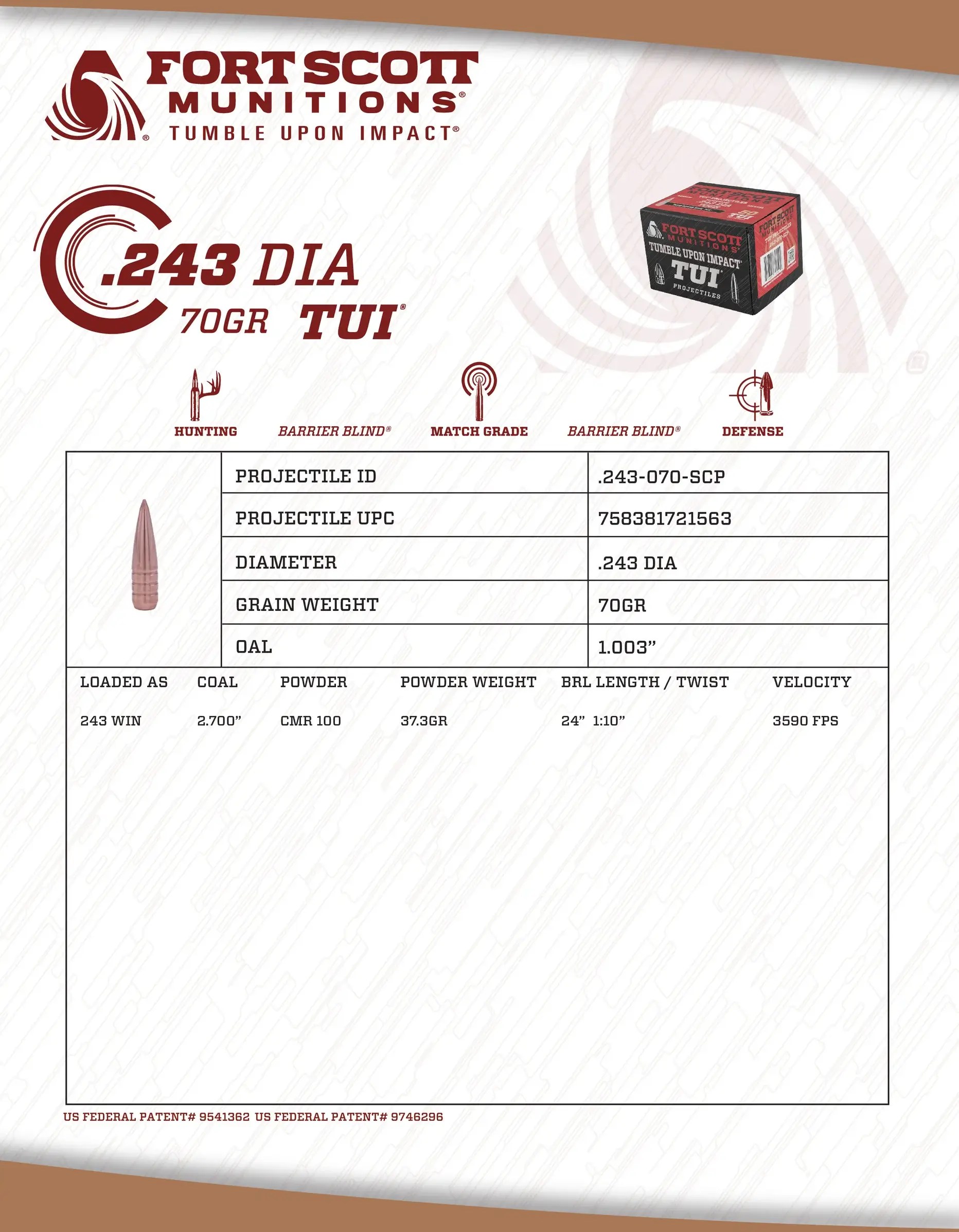 These solid copper rifle projectiles are manufactured by Fort Scott Munitions, a US Manufacturer of monolithic, solid copper bullets and ammunition. These rifle bullets feature a patented Tumble Upon Impact (TUI) design. The TUI bullet is designed to tumble when striking water-based tissue. This effect ensures that the distribution of damage occurs mostly internally, rather than upon initial contact with skin tissue.