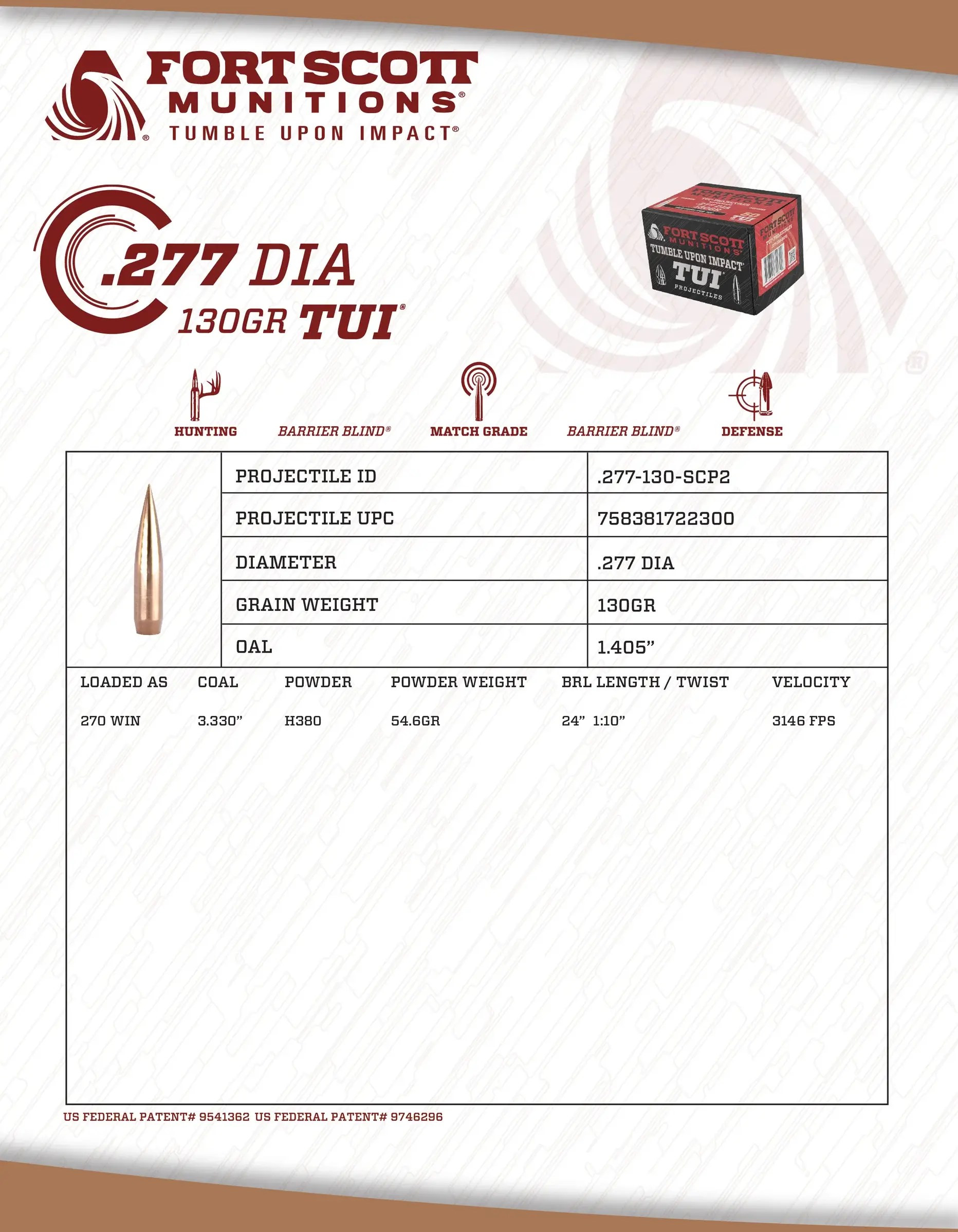 These solid copper rifle projectiles are manufactured by Fort Scott Munitions, a US Manufacturer of monolithic, solid copper bullets and ammunition. These rifle bullets feature a patented Tumble Upon Impact (TUI) design. The TUI bullet is designed to tumble when striking water-based tissue. This effect ensures that the distribution of damage occurs mostly internally, rather than upon initial contact with skin tissue.