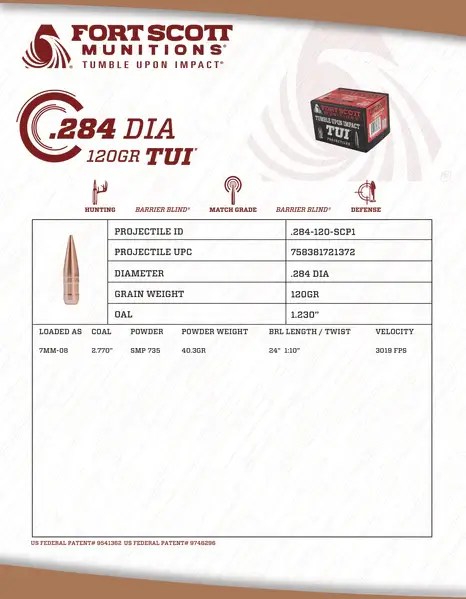 These solid copper rifle projectiles are manufactured by Fort Scott Munitions, a US Manufacturer of monolithic, solid copper bullets and ammunition. These rifle bullets feature a patented Tumble Upon Impact (TUI) design. The TUI bullet is designed to tumble when striking water-based tissue. This effect ensures that the distribution of damage occurs mostly internally, rather than upon initial contact with skin tissue.