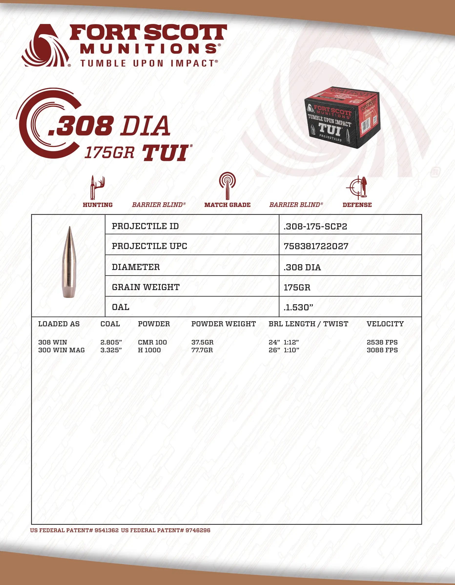 Fort Scott Munitions .308 175 Gr TUI Copper Rifle Projectile